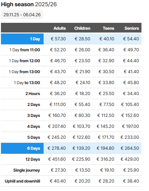 Nösslachjoch 1-3 napos síbérlet (táblázat alapján):