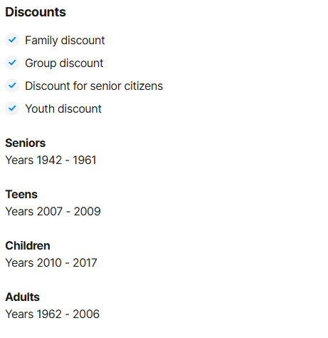 Az árak bizonyos esetekben nem csak a belépőjegyeket, hanem járulékos költségeket is tartalmaznak (adminisztrációs díj, helyi idegenvezető, szervezési költség, csoportbejelentés, transzfer, egyéb költségek, stb.)